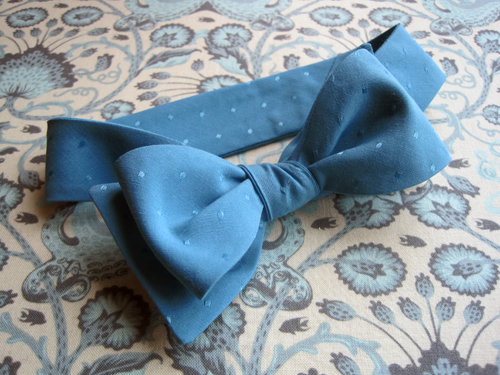 My husband suggested (last week, while I was sewing Easter dresses) that I should undertake another project. I have to say, this was met with a bit of reluctance at first (another project? while I am sewing dresses that I am late on and HAVE to be done by Thursday?!) – until I heard what he wanted me to make. Our good friend’s birthday was on Wednesday of last week and my husband wanted me to make him a bow tie. So – in the middle of making dresses – all else was put aside and I found a great free pattern and stitched up a lovely blue one.