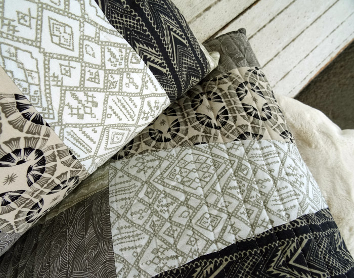 I decided to make a pieced and quilted 18″ pillow tutorial using a shape I’ve been storing away in the back of my head since the spring. It’s very simple, so it allows the beautiful designs to shine through. These fabrics are an amazing mix of taupey-gray, cream, white and black. I’m especially in love with the hand-drawn look of these prints. They are so earthy and organic. It’s a nice break from the crispness we are used to from most available quilting fabrics. Esmari has stocked yardage in the prints I’ve used for these pillows, and she has other colour-ways in fat quarter bundles as well.