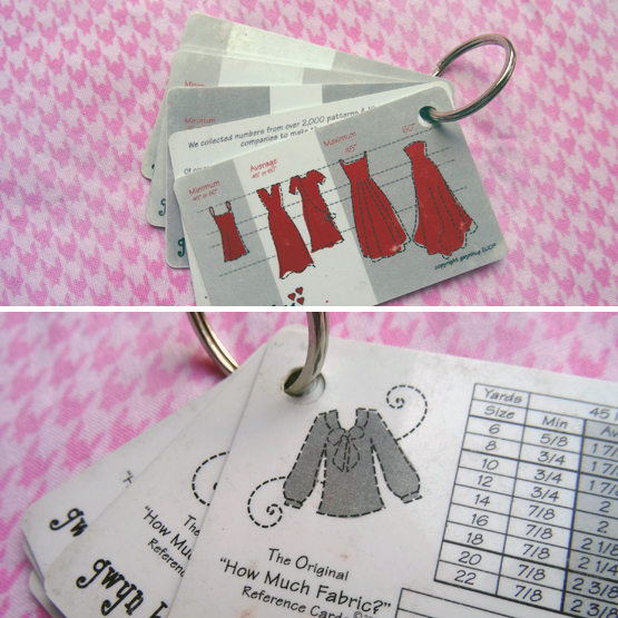 I got these Gwyn Hug Reference cards a few years ago and they have lived in my purse ever since. One side of the card references different types of clothing within a particular category – you can see the different dress options below. The other side of each card references different sizes and the amount of fabric you will likely need to buy for each type of dress. She also includes a handy “add this much” safety margin table – just in case you want to be extra sure you buy enough.