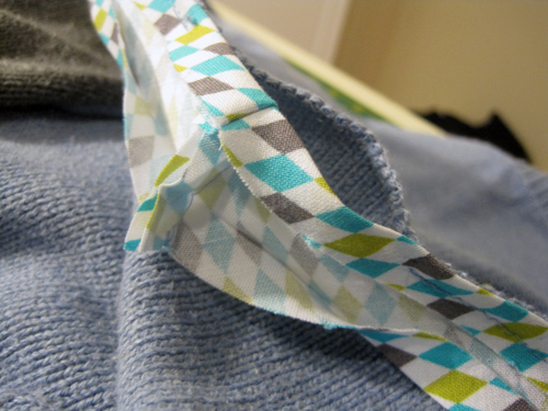 4) Pin the bias and finished edge right sides together with the sweater all the way around the unfinished sweater opening to the middle back of the neck. Sew (using your ballpoint needle) along the edge from both middle-front seams until you get to the middle back-neck. Stop with about 2 inches of opening in the back.